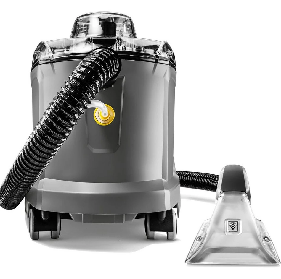 Mit einem geringen Gewicht und einem ergonomischen Tragegriff ist der Kärcher Puzzi 8/1 einfach zu transportieren. Große Drucktasten, die per Hand oder Fuß bedient werden können, steigern den Anwenderkomfort. Der transparente Gerätedeckel und die Handdüse bieten eine bessere Sicht auf die Schmutzflotte.