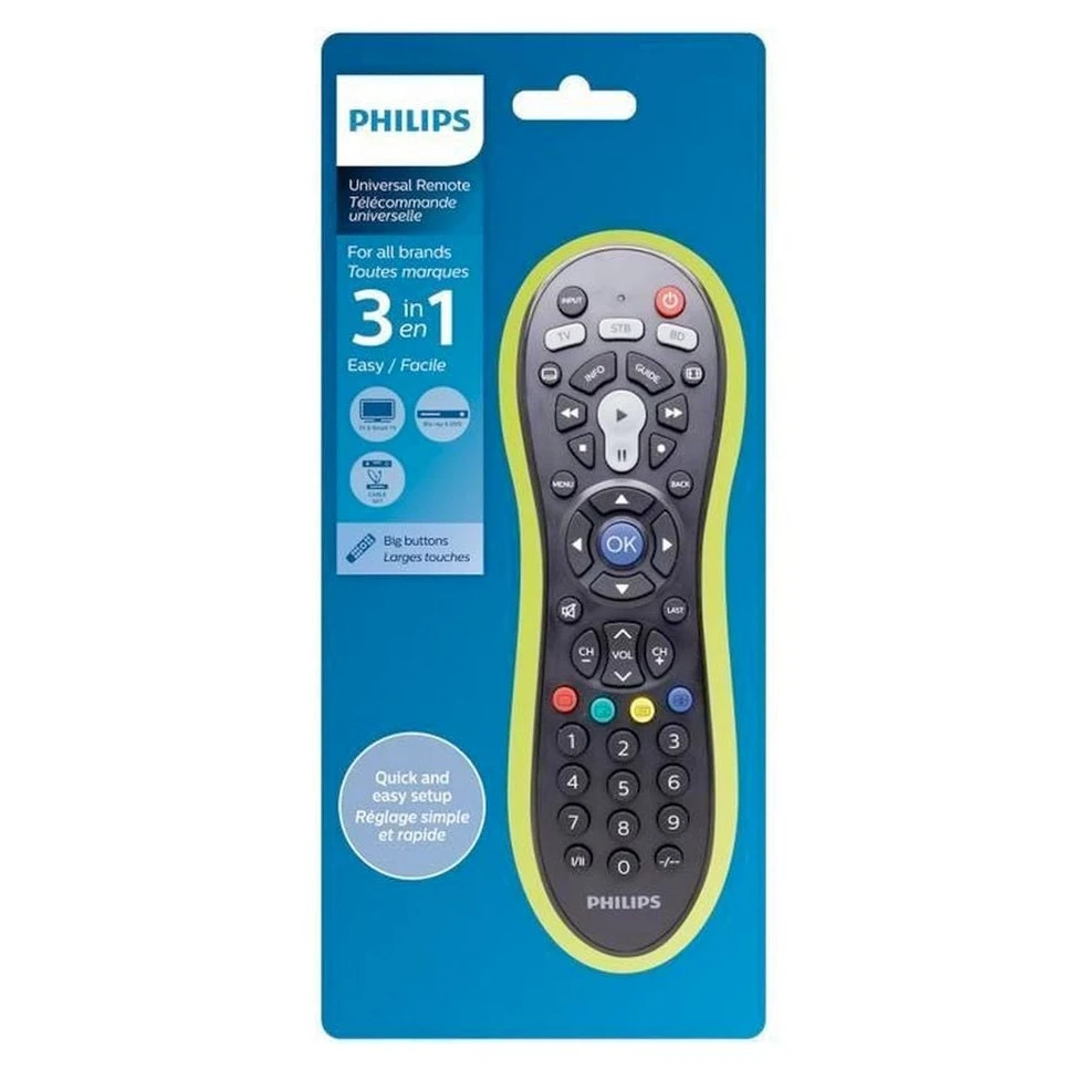 Die PHILIPS SRP3013/10 Universal-Fernbedienung ermöglicht die Steuerung von bis zu drei verschiedenen Geräten mit nur einer Fernbedienung. Sie ist kompatibel mit Fernsehern, Multimedia-Playern, DVDs, Soundbars, Smart TVs und Audiosystemen. Dank der umfangreichen Code-Bibliothek mit bis zu 8000 IR-Codes können Sie die Fernbedienung einfach für eine Vielzahl von Geräten einrichten.